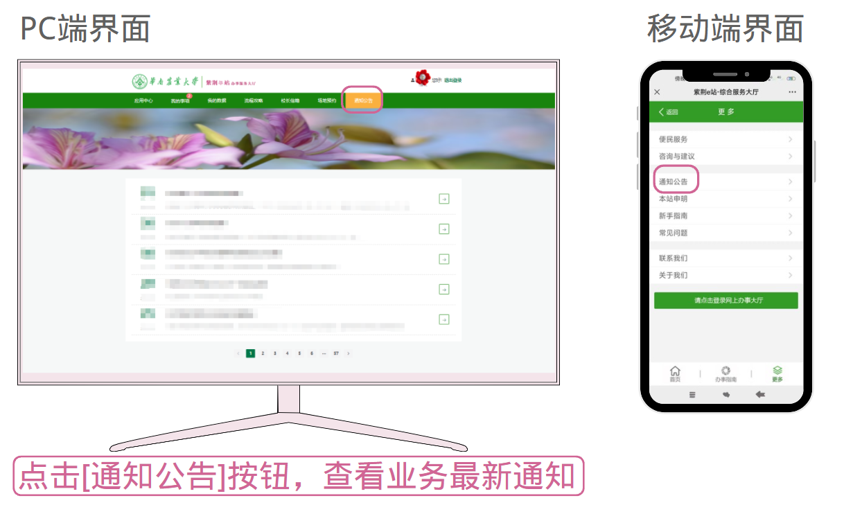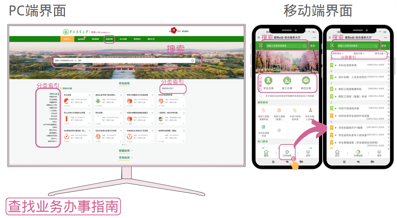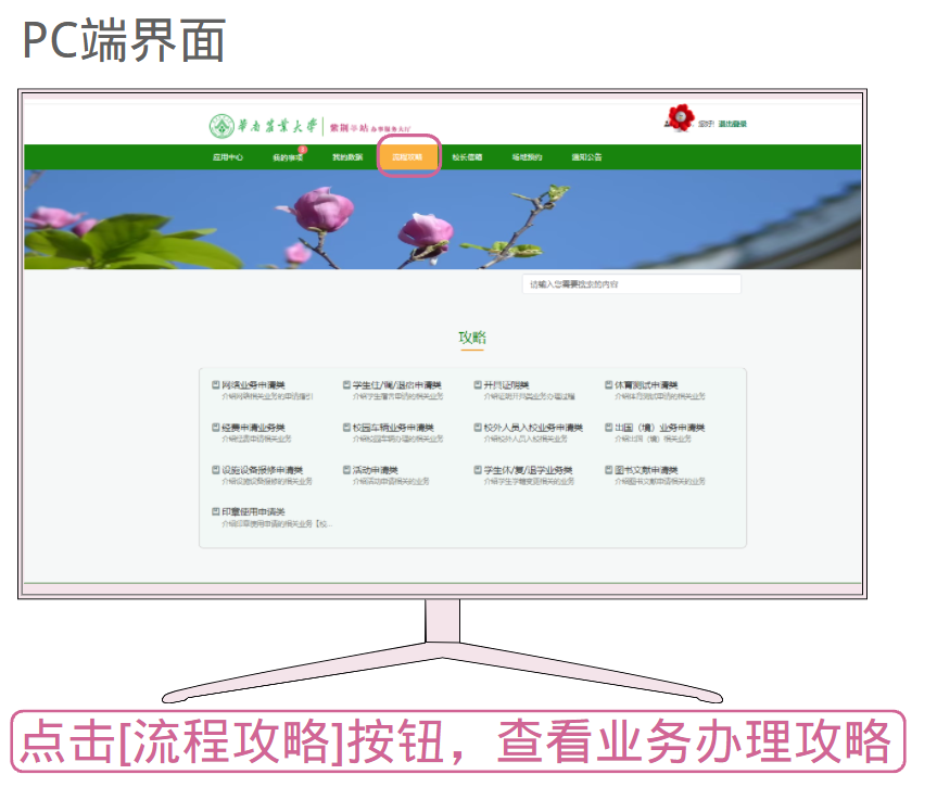 华南农业大学紫荆e站综合服务大厅以“简化、优化、便捷、高效”为原则,致力于打造“服务零距离、办事一站通” 校务服务新体验,通过协同创新、数据共享、业务融合,提供移动优先,线上优先,线上线下融合以建立新型“互联网+校务服务”体系,加快学校信息化建设,不断提升学校管理服务效能和水平。为师生提供精准、便捷的线上校园服务体验。