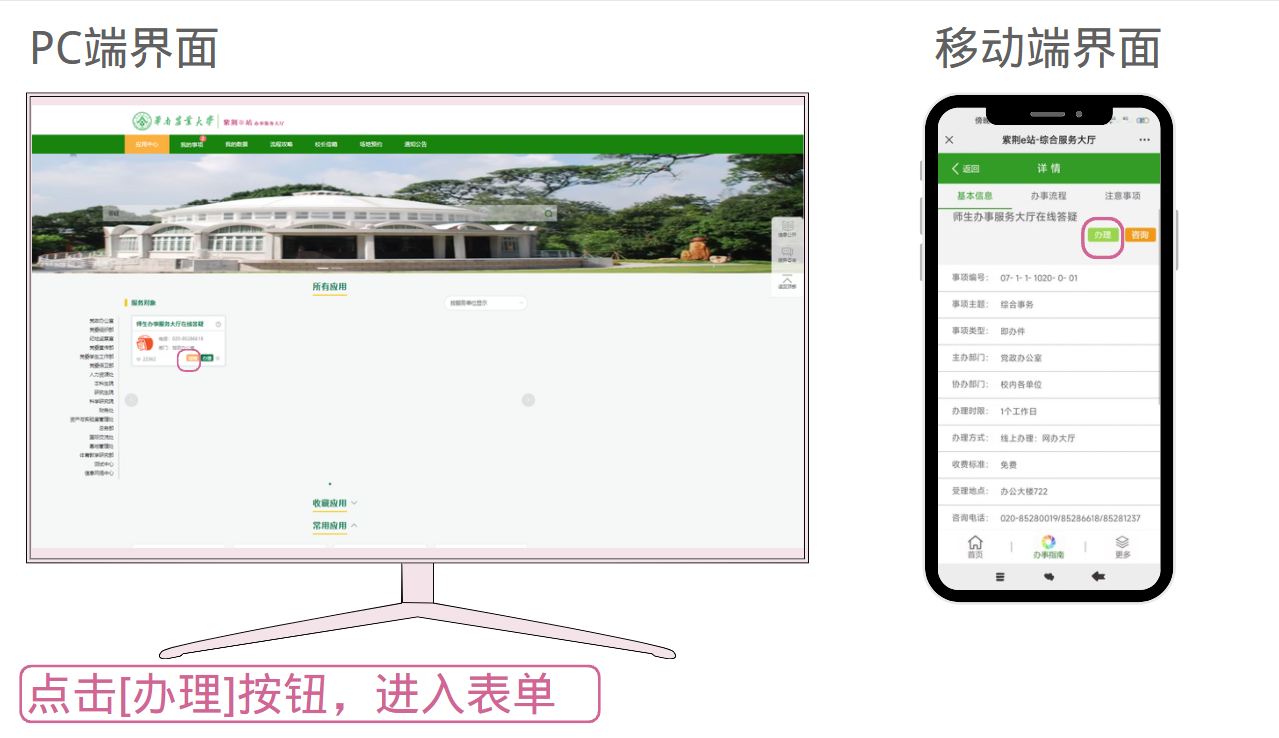 通过登录vpn.scau.edu.cn,在电脑浏览器进入网办大厅进入办理