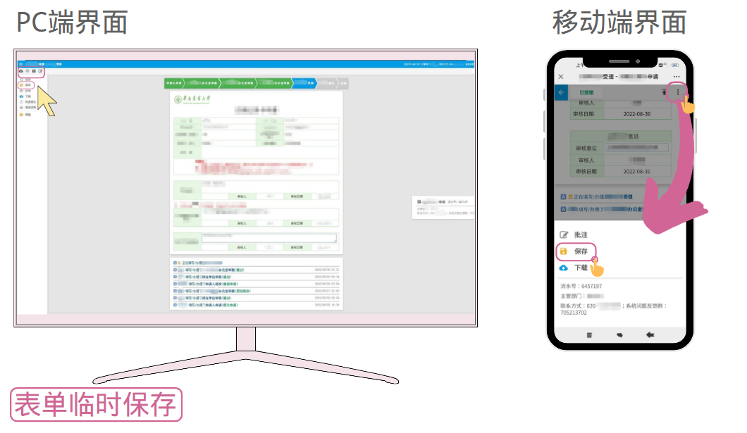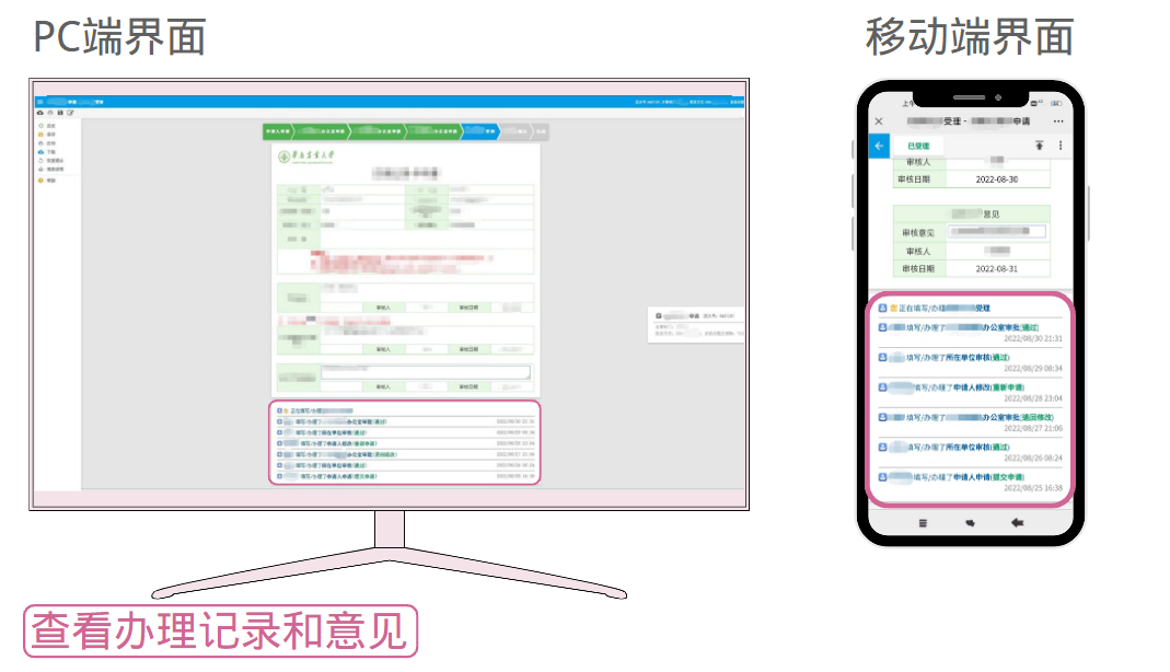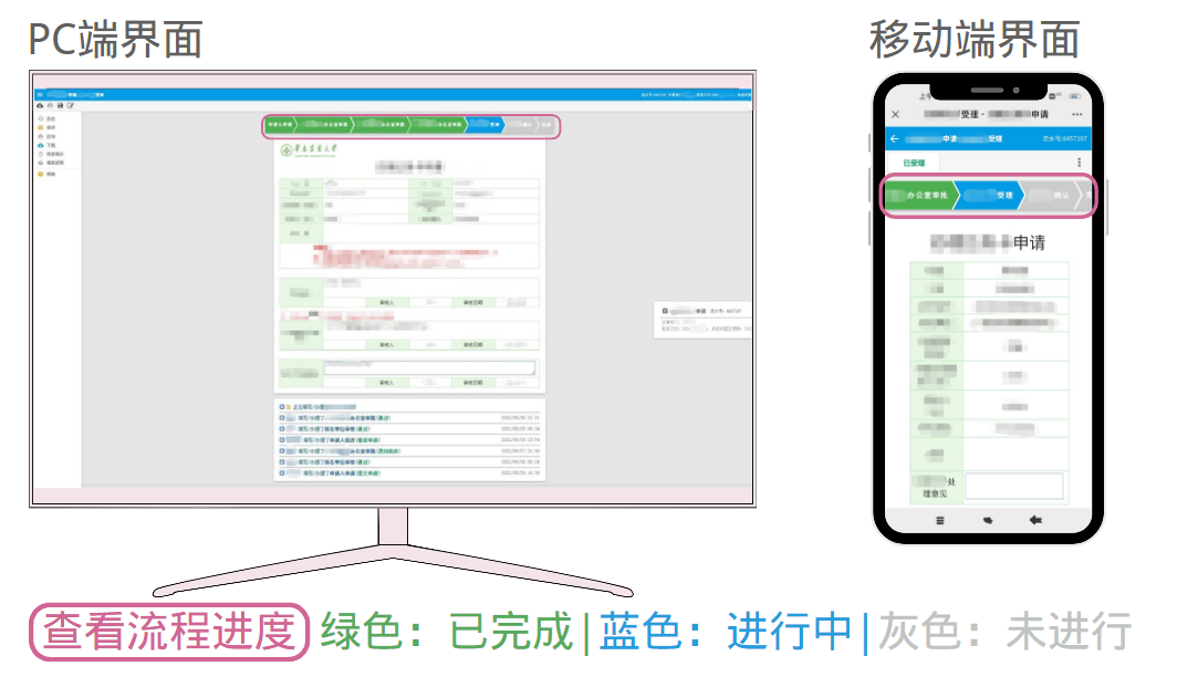 基于学校基础应用服务,通过[学校统一身份认证]登录办理,基于数据中心实现数据对接,减少表单重复填写,办理进度和记录可在线查看,流程完成知会相关部门。