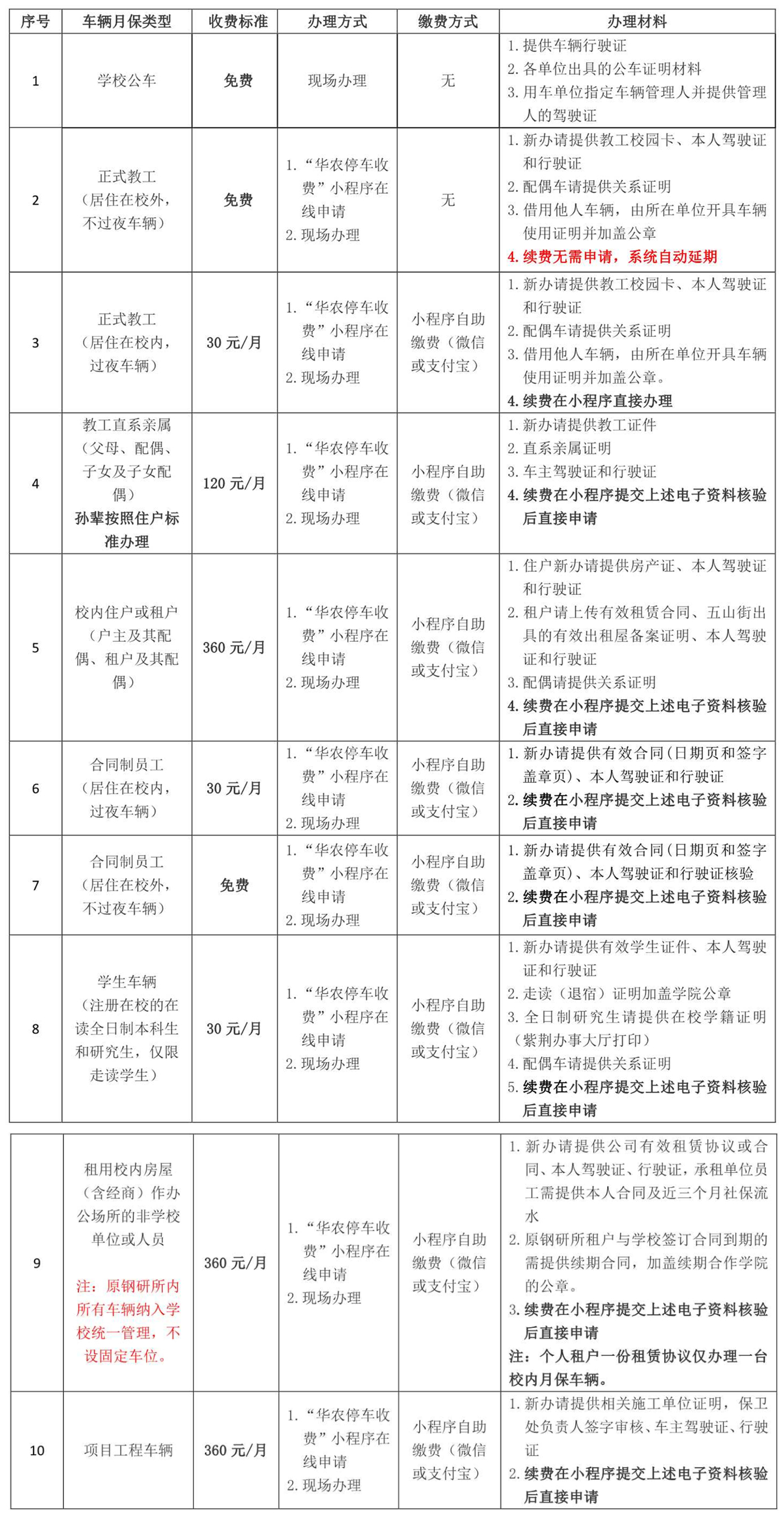 1、学校在职教工过夜月保车辆信息无变化的,请微信登录“华南农业大学停车收费”小程序,选择“校内月保车辆续费”直接进行缴费续期即可。在职教工不过夜月保车辆系统自动延期,无需申请。保卫处将对教职工(含合同制员工)车主的身份信息与人事处教工系统的信息进行核查,对于不符条件办理者学校将取消其月保资格。